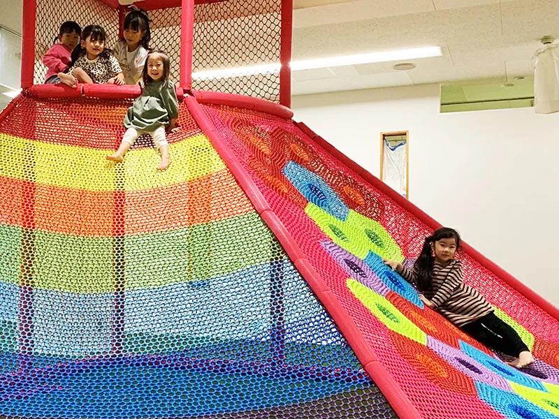 キッズパークレインボーは、まだ小さいお子様から楽しめるプレイグランド。屋内にあるからいつでもだいじょうぶ!遊具やアクティビティで思いっきりのびのびと楽しめます!